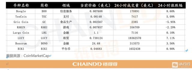 。从领域来看,本周最新的数字现金上市相对分散。本周数字现金的上市主要涉及信息服务、支付、食品生产、游戏、租赁和台币,以下百分比分布如下