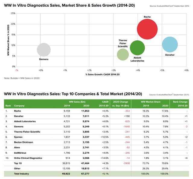 体外诊断行业的主要公司包括罗氏诊断、西门子、丹纳赫、雅培实验室、赛姆瑞丝等。2014年,包括罗氏诊断和雅培在内的行业前五大公司占据了55-60%的市场份额。评估技术相信,到2020年,罗氏仍将占据体外诊断设备产品市场份额的第一位,达到119亿美元,占全球市场份额的17.6%。