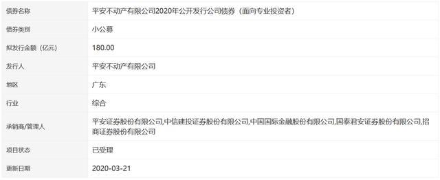 中国房地产网3月21日消息,据深圳证券交易所消息,平安房地产有限公司于2020年发行公司债券(面向专业投资者),并被深圳证券交易所接受。