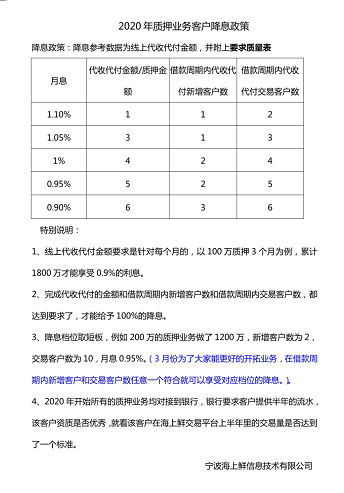 根据其降息政策的内容,以100万用户的质押贷款为例,累计网上收付款1800万可享受0.9%的利息。收付款金额、贷款周期新客户数、贷款周期交易客户数均满足要求,可减少100%。鞭笞还可以降低利率,例如,200万质押业务、1200万自来水、2个新客户、10个交易客户和0.95%的月利率。