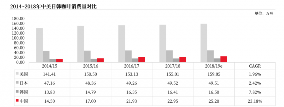 每个人都能感受到背景。中国的咖啡消费市场正在高速发展。2015年至2018年,咖啡消费年复合增长率超过20%,远高于美国、日本、韩国等地区。长期以来,中国人对咖啡饮料的消费几乎是以速溶咖啡和即饮咖啡的形式出现的。在以星巴克为代表的连锁咖啡品牌的教育下,咖啡粉越来越受到消费者的欢迎。
