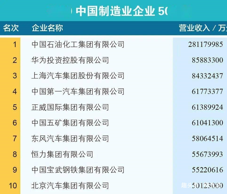 国内制造企业排名第一名的是中国石油化工集团,年营收高达2.81万亿元,这营收相当于3个华为。去年实现税费3122亿元,平均每日交税超8.5亿元。业务范围包括石油、天然气的勘探、开采、储运(含管道运输)、销售和综合利用。是中国最大的成品油和石化产品供应商、第二大油气生产商,是世界第一大炼油公司、第三大化工公司,加油站总数位居世界第二,世界500强企业中排名第2位。