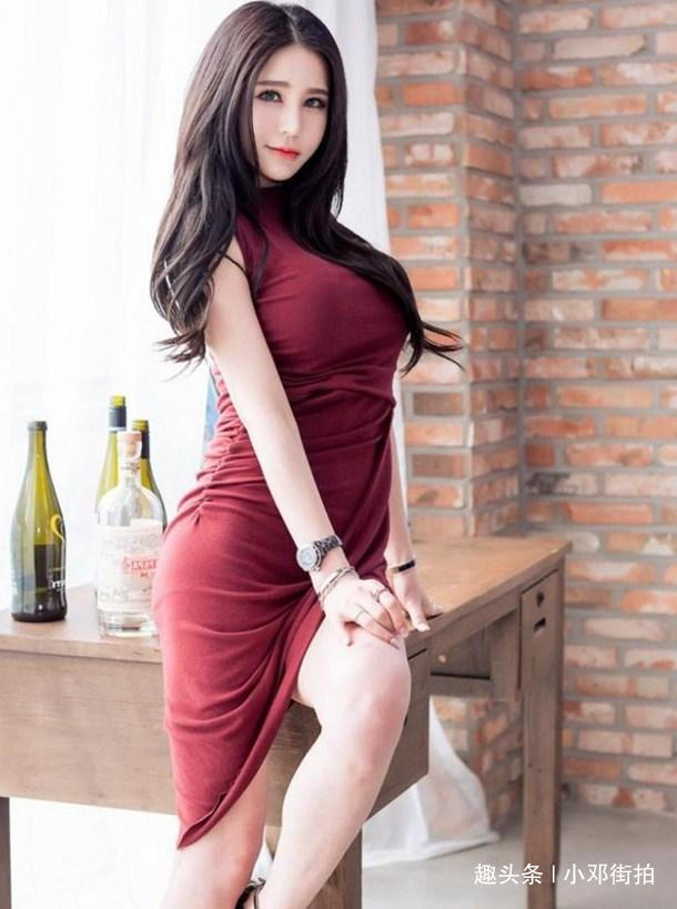 一袭酒红色吊带包臀裙, 搭配出美女的知性女人味