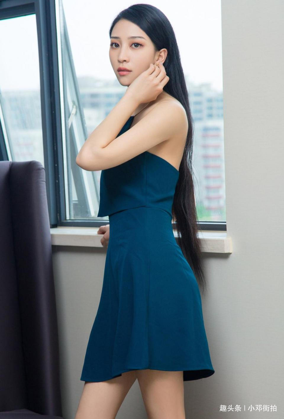 这款纯蓝吊带裙在美女的衬托下,充满了女人味,采用了非常简单的版型设计,但是从细节上看,这款裙子看起来非常精致。