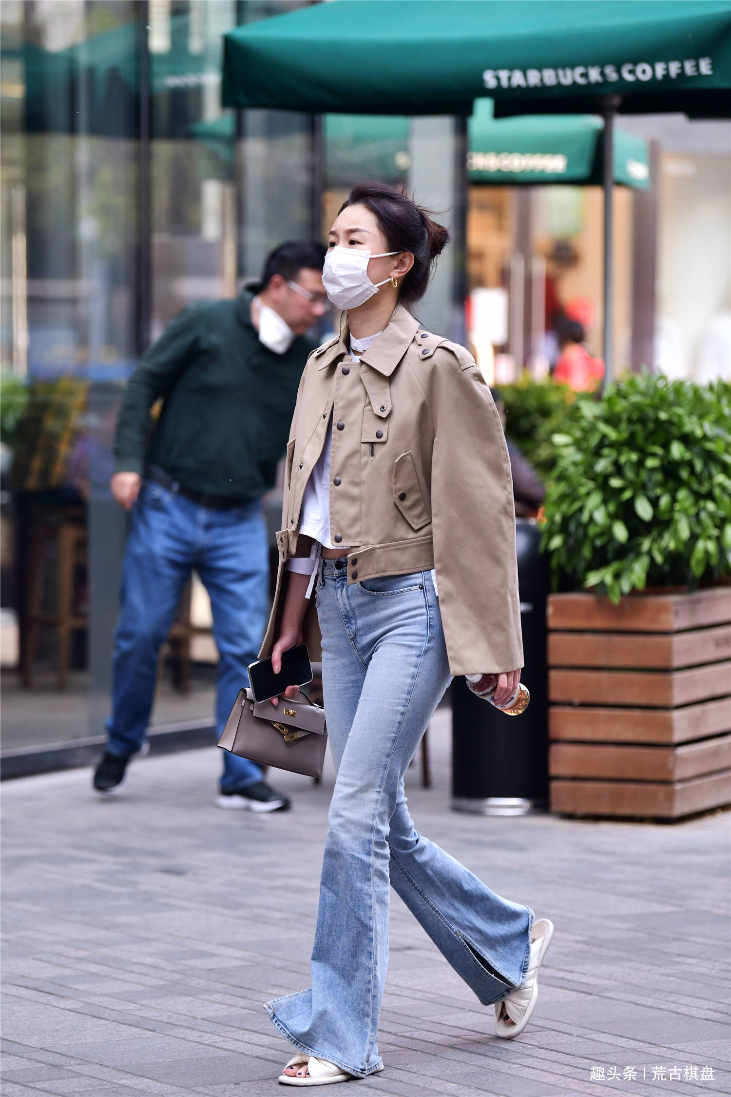 搭配是一种态度,即使你戴着面具,只要你出去,你就会表现出一种微妙的时尚感。这个漂亮的女人选择了一条蓝色的大喇叭牛仔裤,生边腿,很好看,一双裸色的尖头细高跟鞋,这才撑起了这条牛仔裤,也显得很高,配着身材比例的效果,穿着一件很精致的效果,一件米色的外套,一个短的设计,还有一条腰带,这样扎起来,显得很有个性,也衬托出一种精致的感觉。