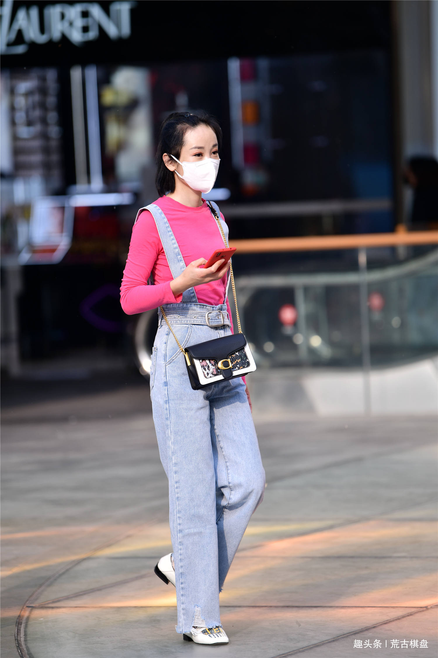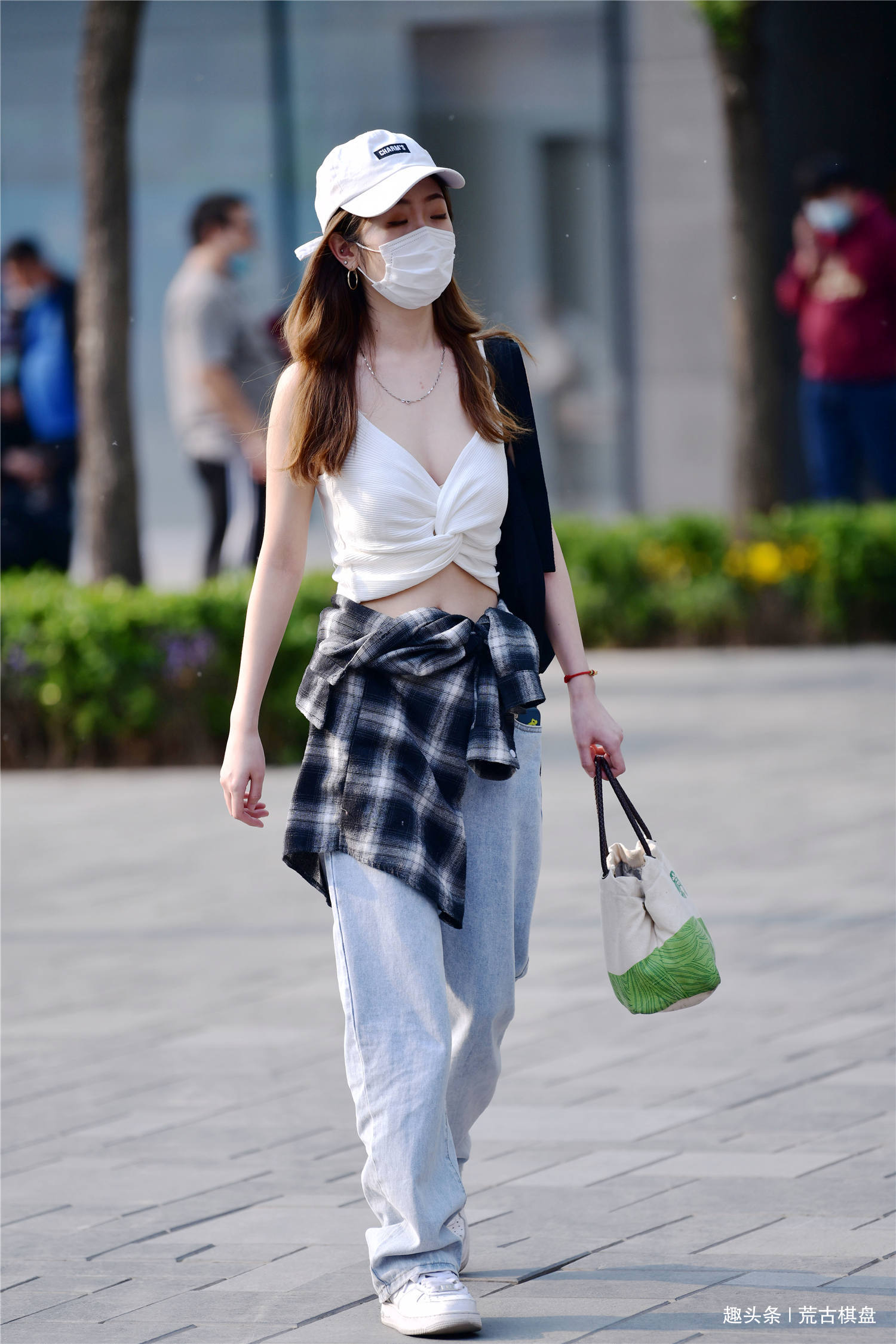 今年有一个新趋势,那就是带着面具去购物。许多去购物的路人都自愿戴上口罩。在前几年,有些人会戴口罩,但不会很多。带面具的牛仔裤成了另一种风景。这位美丽的女士选择了一条水洗蓝色直筒牛仔裤,一双白色运动鞋,以及一件系在腰间的黑白渐变格子衬衫。这会让她觉得自己像个小女孩。白色吊带与个性效果相匹配。白色口罩配有帽子,显示出非常年轻的匹配感。
