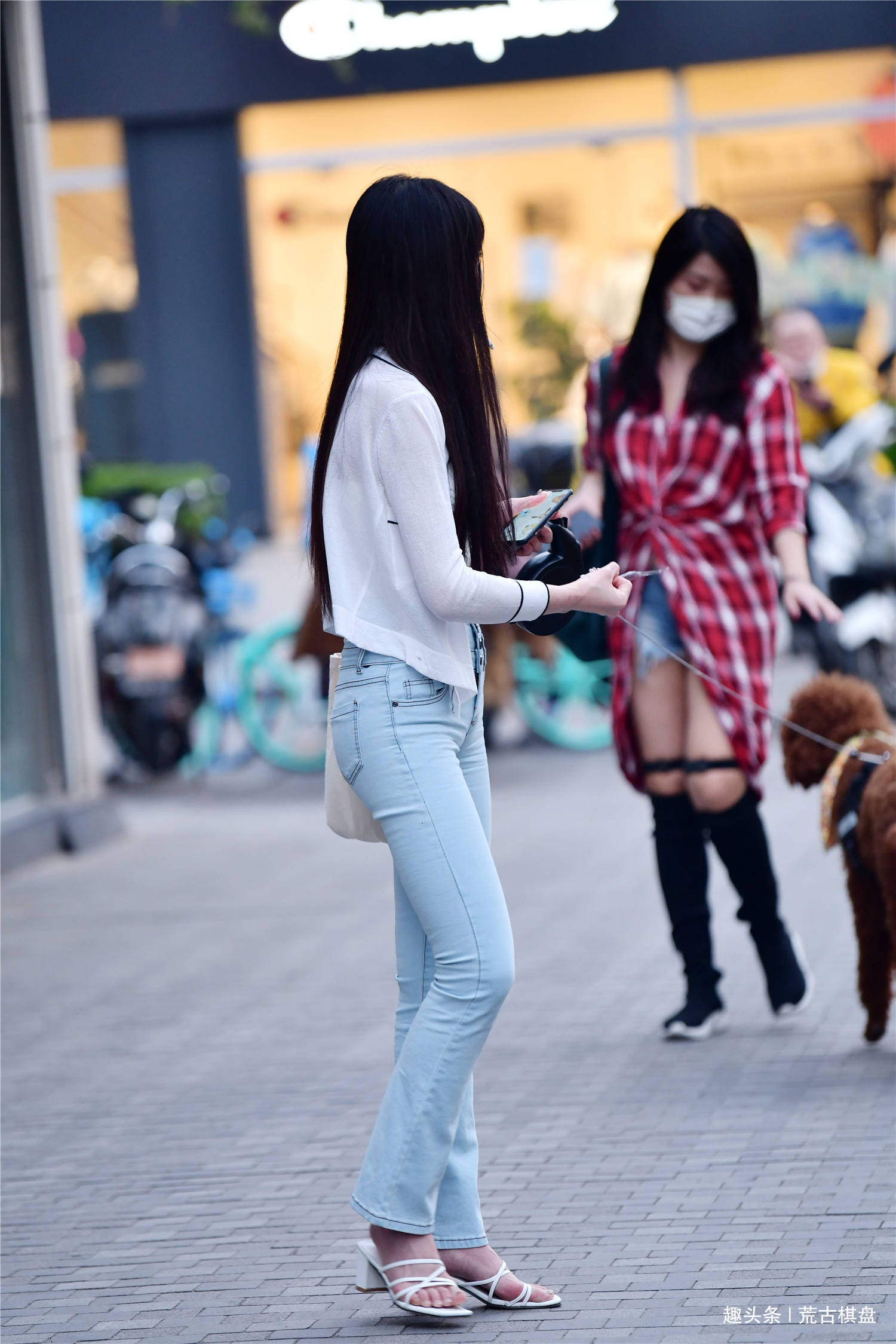 今年春天外出的女孩会戴口罩,这也是一种新趋势。留长发的美女选择白色小开衫,简单又时尚。一条浅蓝色的修身牛仔裤,底部有一条略直的腿,看起来很苗条,有直腿的效果。脚下是一双白色的厚底凉鞋,上部是十字带,个性简单,但也衬托出一种精致的感觉。