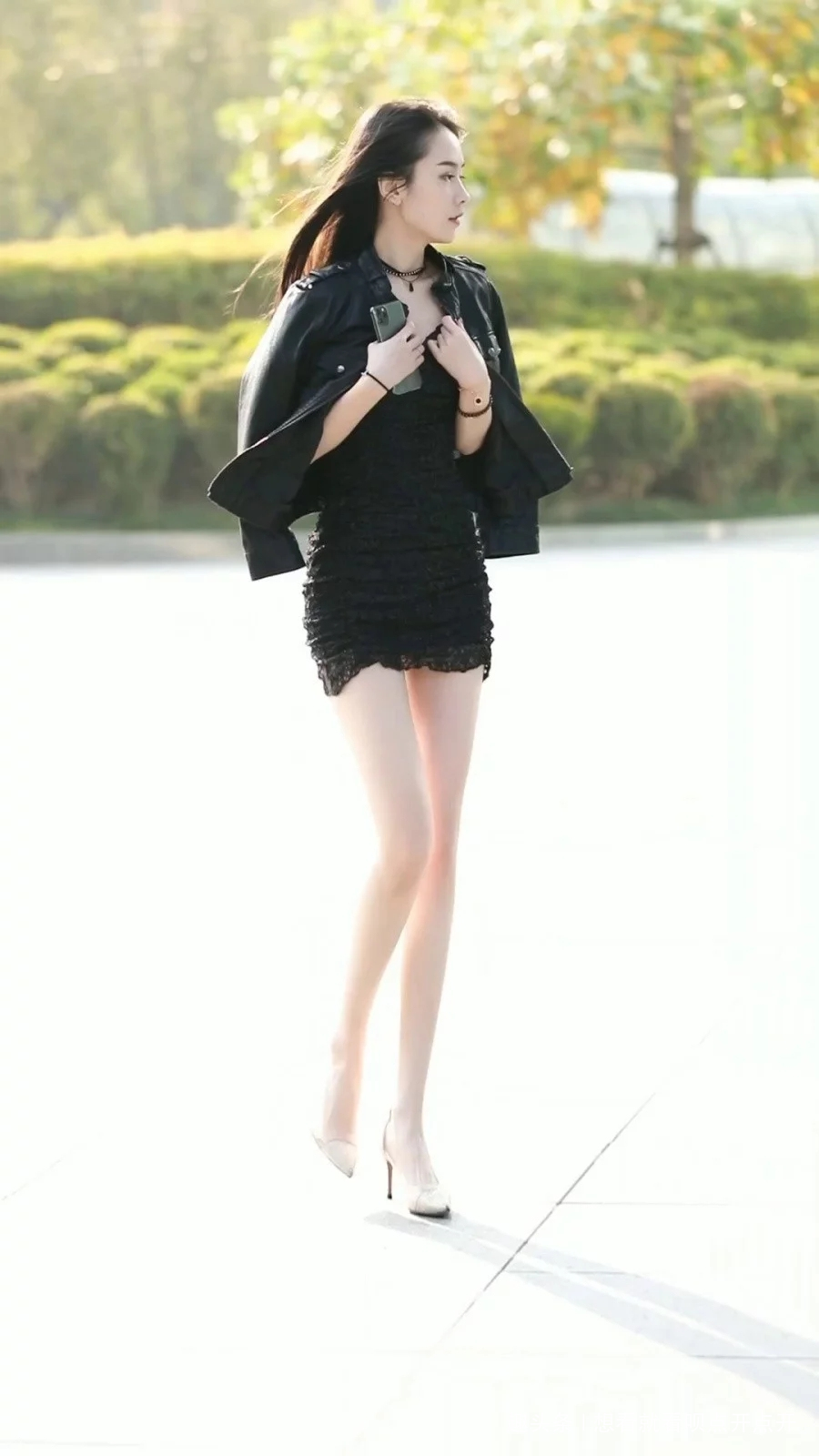 路人街拍,姑娘优雅时髦,搭配一条黑色的皮裤,成熟有魅力