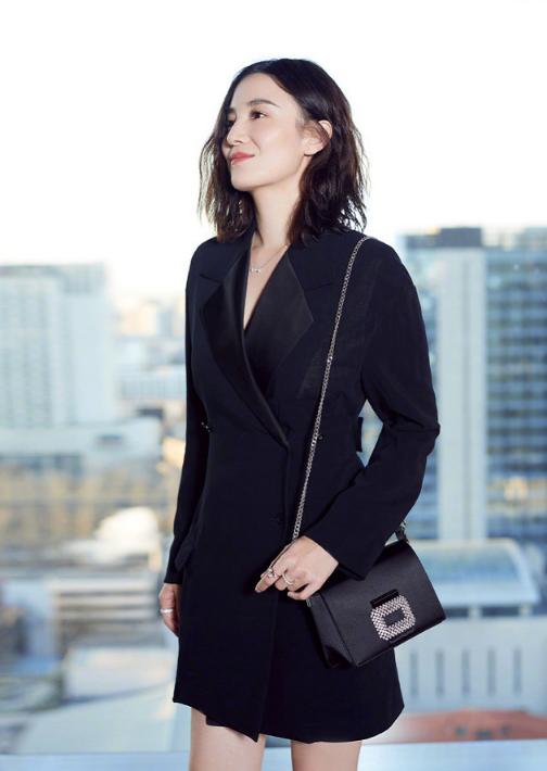 宋佳的黑色连衣裙看起来非常低调,充满优雅的质感。整条裙子在款式上与套装非常相似,但不如套装那样严谨。她有一种休闲的心情,顶部领口有一个金色的羽毛设计,这使得整个套装看起来高贵。更大间距的按钮设计让你的身材更具线性。