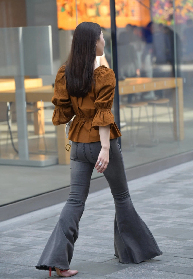 就裤子而言,我姐姐选择了一条牛仔裤。这些裤子不是普通的款式,而是个性洒脱的喇叭裤。其次,喇叭裤的特点是将裤体的裁剪部分设计成从膝盖以下逐渐放松成喇叭形,使整条裤子更加时尚性感,进一步改善整体造型。