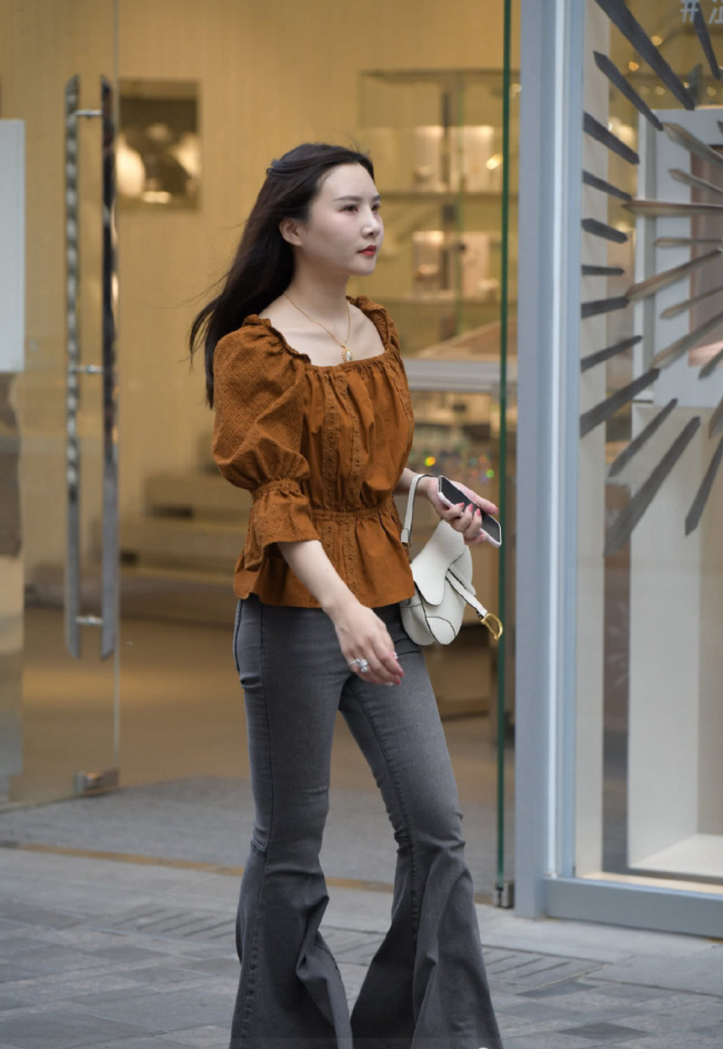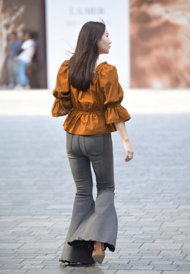 除了喇叭裤之外,毛边裤腿的不规则设计给整条裤子带来一种放松和柔软的感觉,使裤子摆脱了标准裤腿的僵硬感。说到鞋子,高跟鞋自然是最合适的选择。毕竟,喇叭裤很挑剔,需要相对较高的身材。如果身材不够,很容易造成短腿的效果。幸运的是,这个小妹妹各方面都很匀称,从而大大增强了自然美!