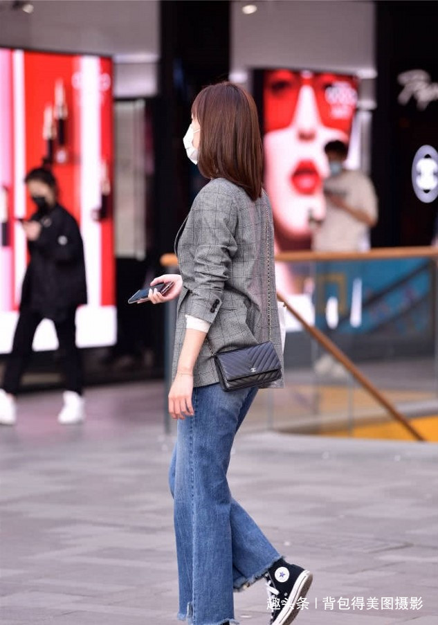 4.选择一条你喜欢的直筒牛仔裤,它有很好的减肥效果,也能衬托出苗条的身材。小妹妹选择了一条边缘粗糙的牛仔裤,脚上是一双黑色帆布鞋,鞋底是白色的。这是一种非常经典的风格。许多时髦的小姐妹喜欢在上身搭配帆布鞋和灰色格子套装。这种搭配非常简单,也有一种等级感和夏天的感觉。