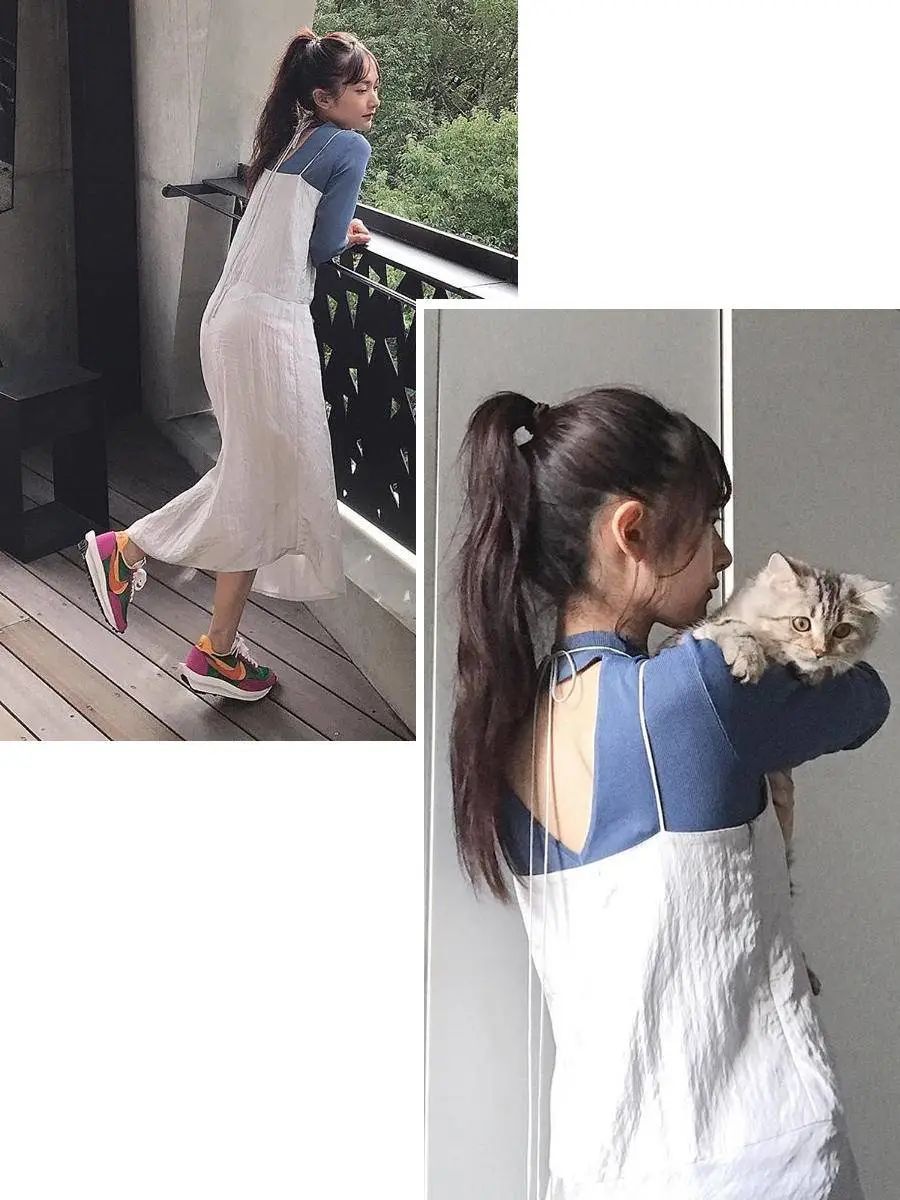 卫衣 + 吊带裙同一个思路,你也可以试试吊带裙外面套一件卫衣,瞬间好像多了好多裙纸的感jio。