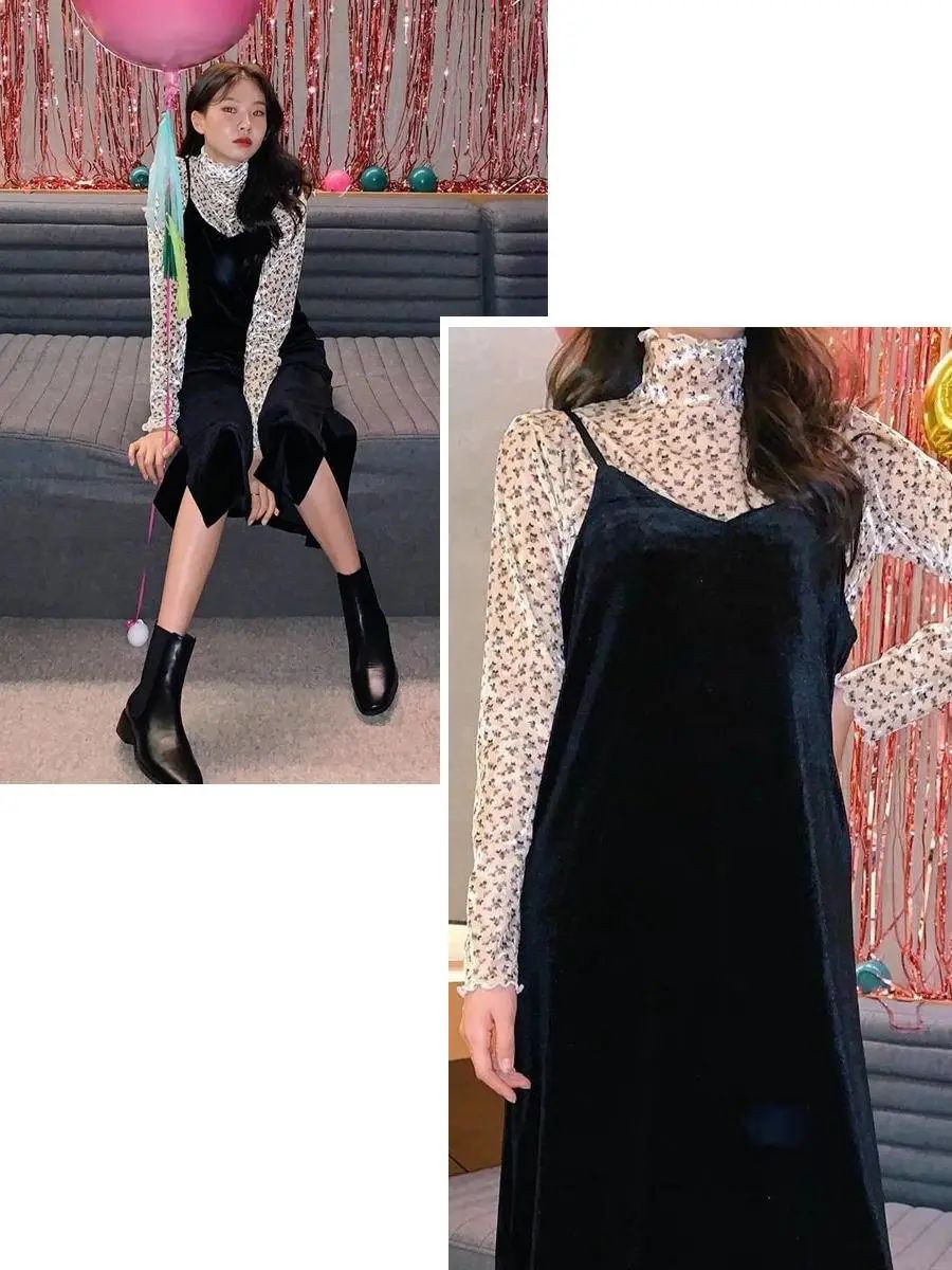 薄款半高领 + 吊带裙像Iola这里呢,单穿针织也是有点儿热了(比较适合穿针织外套,热的时候脱掉),所以搭配薄款打底更适合~