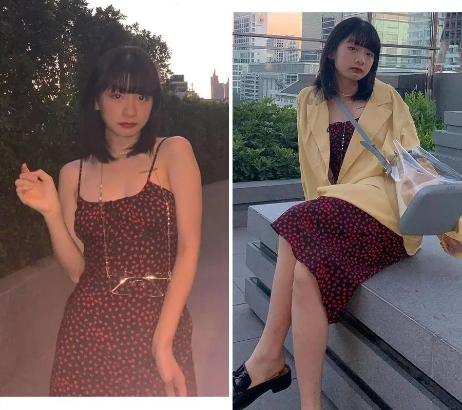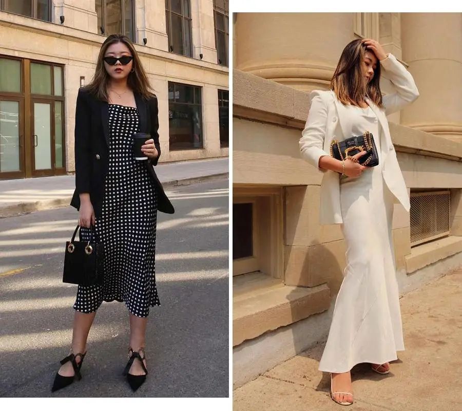 西装外套 + 吊带裙她来了她来了,她带着同色系西装搭配吊带裙来了!这样一看就明显了,西装搭配吊带裙穿起来真的很显瘦,推荐胳膊粗的集美都这样穿起来。