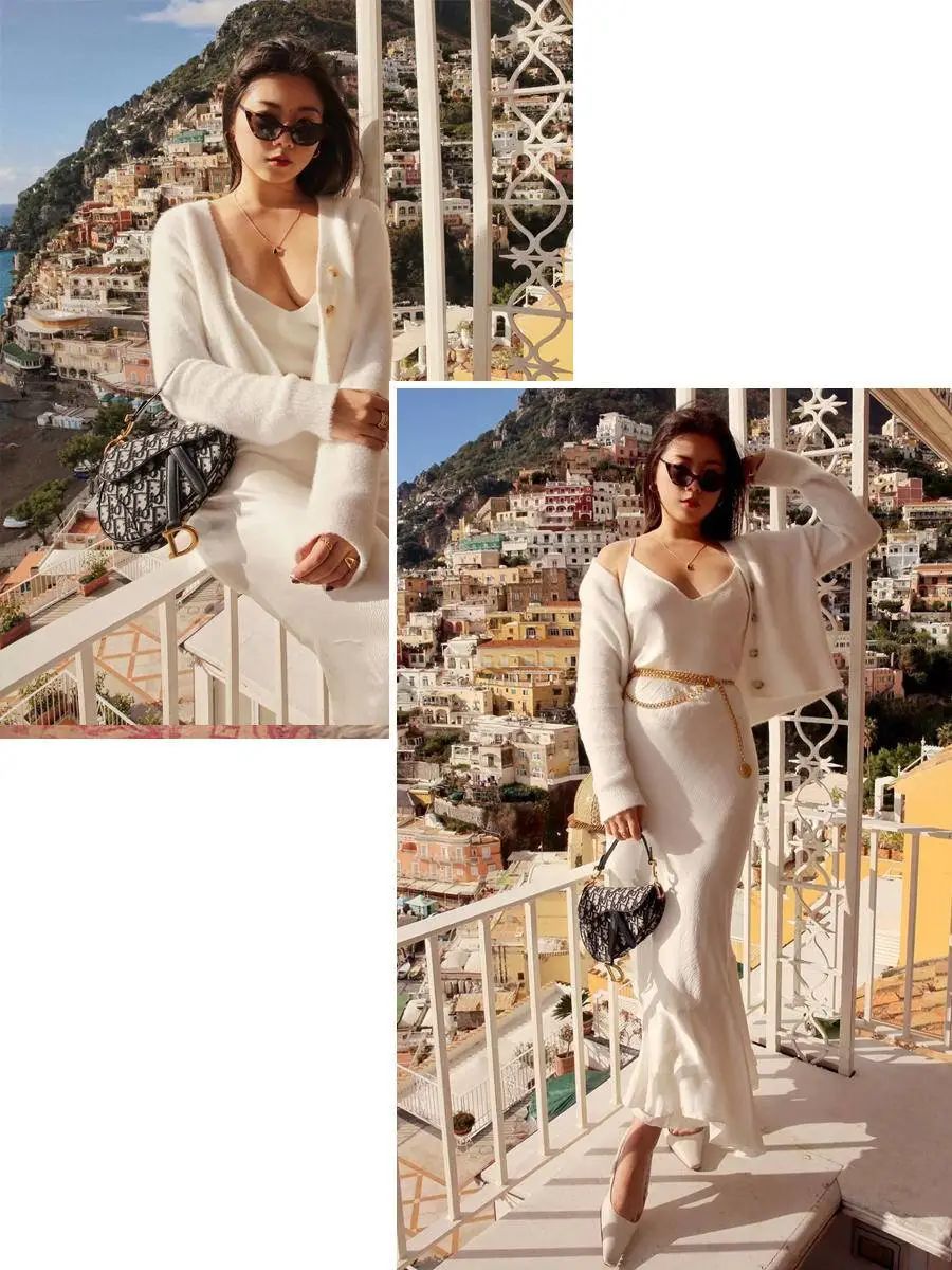 法式复古的波点吊带裙,与经典款大地色风衣的搭配很喜欢,无论白底黑波点,还是裙子的高衩,都透出风情万种。针织外套 + 吊带裙应付早晚温差的针织外套也不能少哦~白色丝质吊带裙+短款白色针织外套,又纯又欲的感觉,加一条金色的链子腰带点缀,既凸显了腰线,简单的搭配又添了一分华丽。