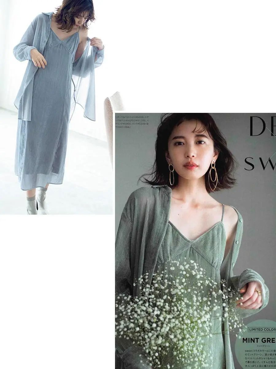 衬衫 + 吊带裙春天的时候通常都把开襟衬衫当做外套穿,一衣多穿不能太爽,所以衬衫外搭吊带裙也是很常见的~