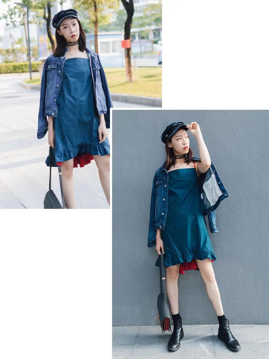 单看一定觉得很难搭配,但撞色真的太出彩太好看了!牛仔外套 + 吊带裙我之前也穿过一套牛仔外套与吊带裙的搭配,由于吊带裙是比较个性的设计,所以我觉得搭配牛仔外套更合适~搭配海军帽还更具混搭感~