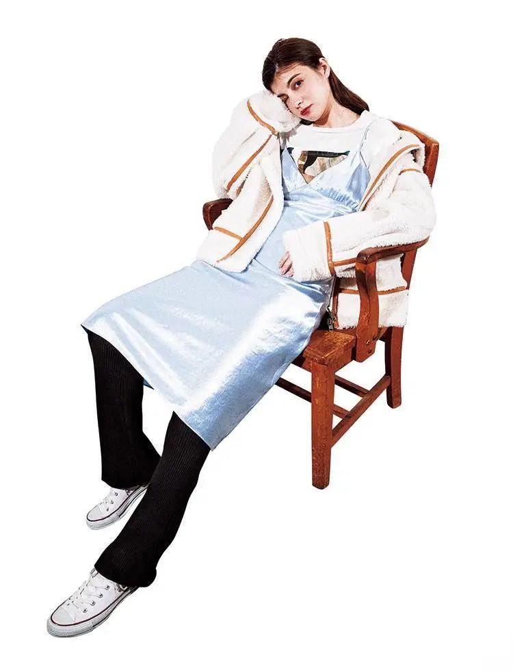 内搭+吊带是比较透气感的颜色,减轻了大针织衫的厚重感,比较容易carry。比较特别的地方是模特穿了贴脚过膝靴,很有气场。羊羔毛外套+T恤搭配吊带,在穿上黑色牛仔裤打底,貌似是乱穿衣,但谁看了不说一句随性又可爱呢?