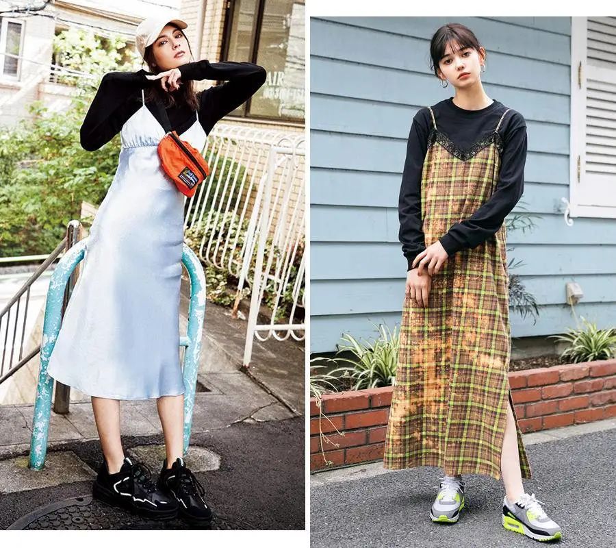 话说黑色长袖T搭配黄橙格纹的吊带裙好好看,想泳有!另外,绸缎吊带裙混搭斜挎腰包也是爱了爱了,好有个性哦~条纹长T搭配黑色吊带裙,看起来就比较顺眼了~