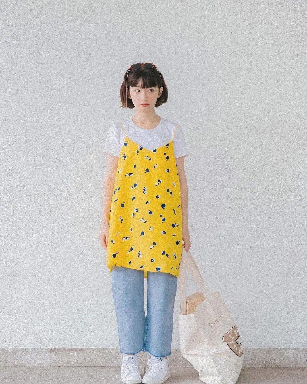 用黄色吊带搭配浅蓝牛仔做打底裤,这个明快的颜色看上去就很春天。而且穿的是有点包容度的直筒裤,隔着屏幕都感受到舒适。