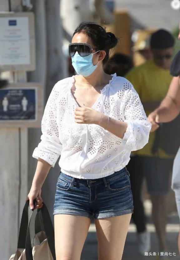 侧面的仪态问题很明显,弯腰驼背完全没了女王范,随性扎个丸子头也是格外居家的风格,头顶竟然还佩戴着蝴蝶发卡。镂空材质的衬衣本来想秀下小性感,但是收腰设计很容易把腰线显出来,无意秀腰的巩俐,游泳圈显然不是那么听话,实在太影响整体形象了。