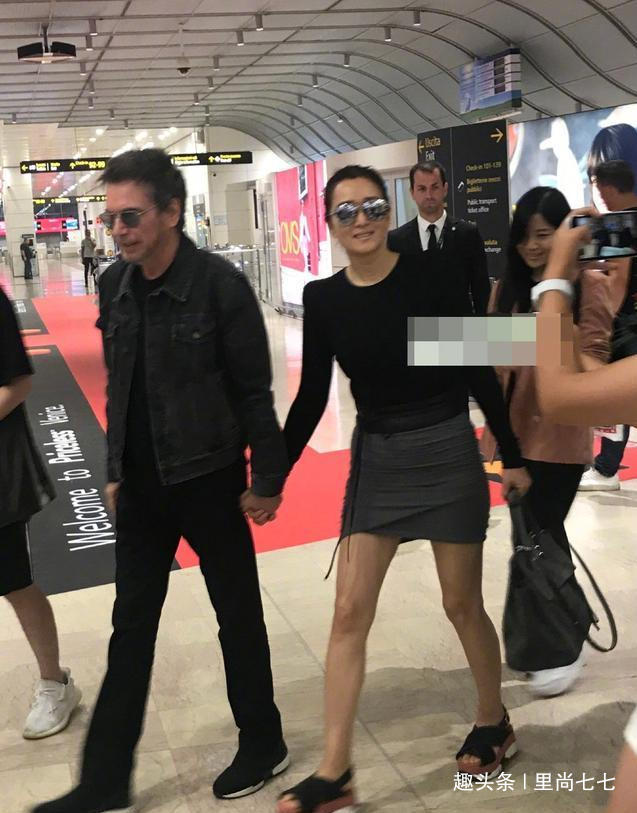 跟在老公身边的巩俐,总是穿得像个小女人,包臀短裙搭配针织衫上衣,秀美腿的同时也要秀曲线,难得能够把垫肩设计的衬衣穿得不壮硕。浮夸的厚底鞋增高,有点太显厚重,老公在身边似乎对时尚感完全不在意了。