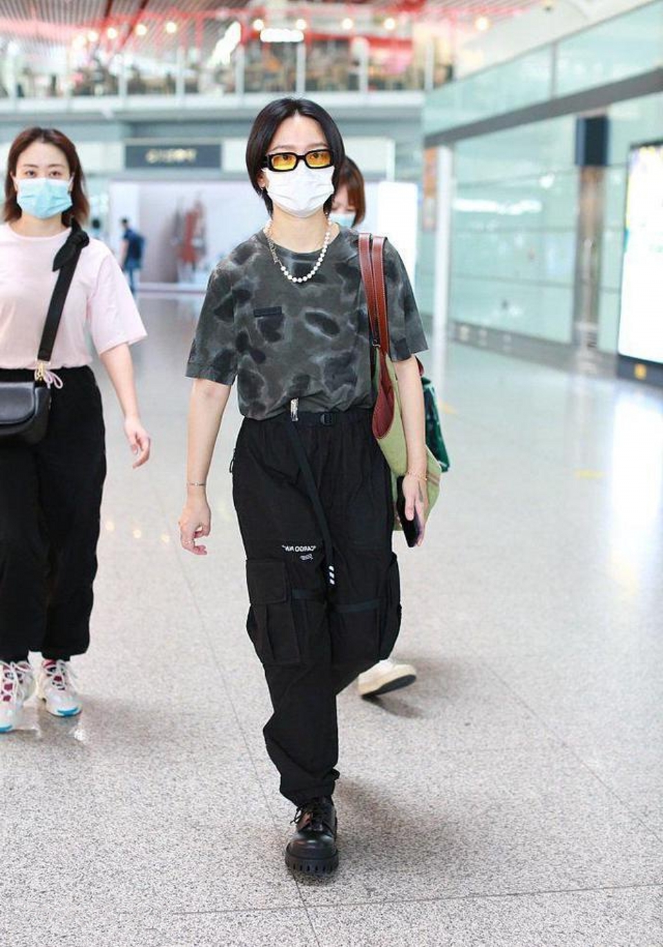 在所有单品之中,T恤的表现力一直是无人能敌的。她现身机场,上身一件中性风的T恤。迷彩的印花容易凸显出凌驾于性别之上的美感,颇有一种女生帅起来就没有男生什么事了的感觉。她一向是短发的造型,穿起这种中性风的T恤毫无违和感,很适合帅气的女生模仿。工装是为方便工人们劳动而设计的,近年来工装的风格随着时尚的发展越来越受到很多人的喜欢,明星的造型中工装风出镜率是极高的。她下半身搭配一件工装风格的裤子,超大的版型和设计感十足的口袋设计,不失时髦感。她的工装裤采用了束脚的设计,再搭配一双马丁靴显得恰到好处,腿部线条瞬间拉长,还带来一种强大的气场,霸气十足。