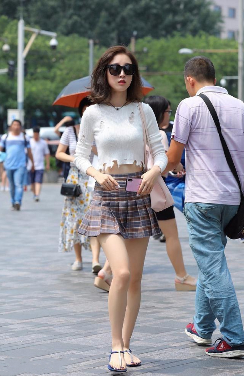路人街拍,靓女通过精致搭配,衬托出的大长腿,回头率百分百