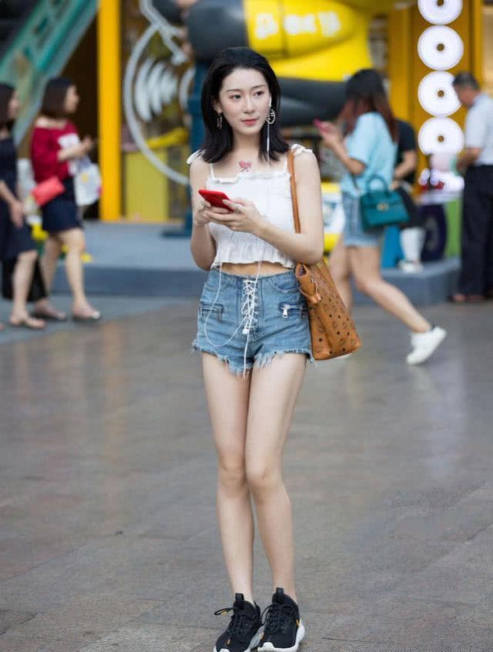 街拍,美女休闲短衫搭配牛仔热裤,看起来精气神十足