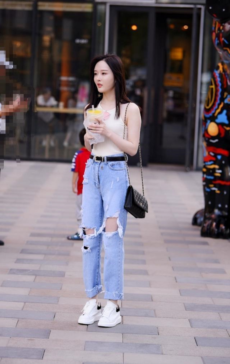 夏日时尚元素,破洞牛仔裤搭配白背心,街头风很足