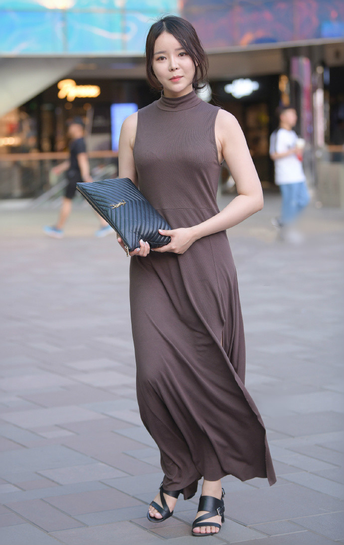 对于长裙来说,搭配高跟鞋自然是最好的选择。你知道,只有高跟鞋能帮助你更好地控制长裙。这个小妹妹就是这样。她选择了一双厚底高跟凉鞋,这不仅可以修剪她的身材,而且很舒适。此外,这款长裙采用了略微收腰的设计,使腿部线条更加修长。再加上扎短发的风格,小妹的气质更为平静和端庄。