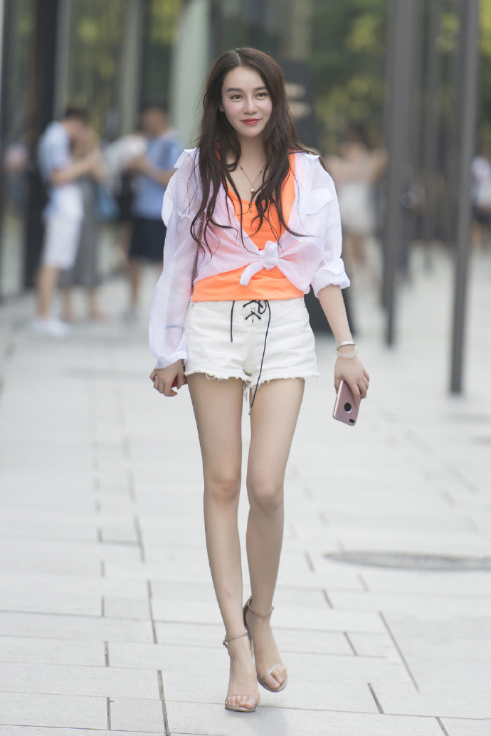 在这条短裤的帮助下,再加上一双素雅的细高跟鞋,小妹妹修长的腿部线条就很容易展现出来。气质也显示出一些优雅的魅力。在选择夹克时,为了让整体外观更加出众,小妹妹选择了里面穿橙色背心,外面穿薄雪纺衬衫。服装的低龄化和个性化风格使整体外观看起来年轻而富有风格。