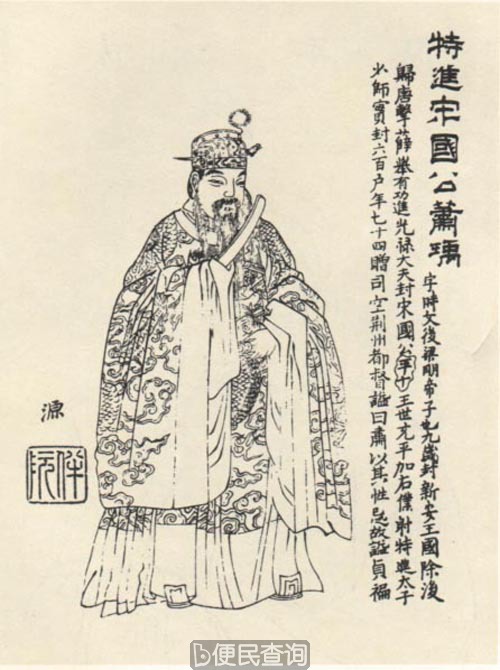宋国肃公萧瑀(公元575年—648年7月19日),萧皇后之弟。萧瑀自幼以孝行闻名天下,且善学能书,骨鲠正直,并深精佛理。被隋炀帝疏斥,唐朝时深得李渊信任。武德元年六月,拜内史令。高祖曾对萧瑀说:“公之言,社稷所赖。”萧瑀出身显贵,看不起杜如晦、房玄龄、温彦博、魏徵等人,常与之发生争执。萧瑀饮宴时对唐太宗开玩笑说:“臣是梁朝天子儿,隋朝皇后弟,尚书左仆射,天子亲家翁。”贞观二十二年六月廿四癸酉,病卒,遗命以单衣简朴安葬。追赠为司空、荆州都督。唐太宗有诗赠:“疾风知劲草,板荡识诚臣。勇夫安识义,智者必怀仁”。