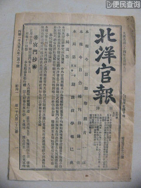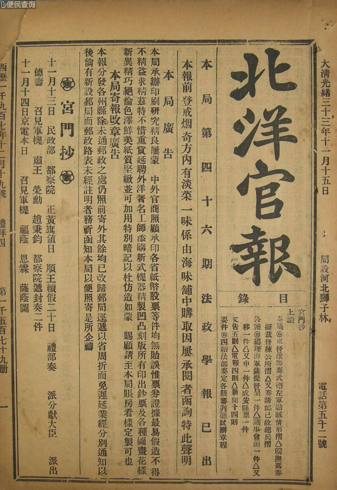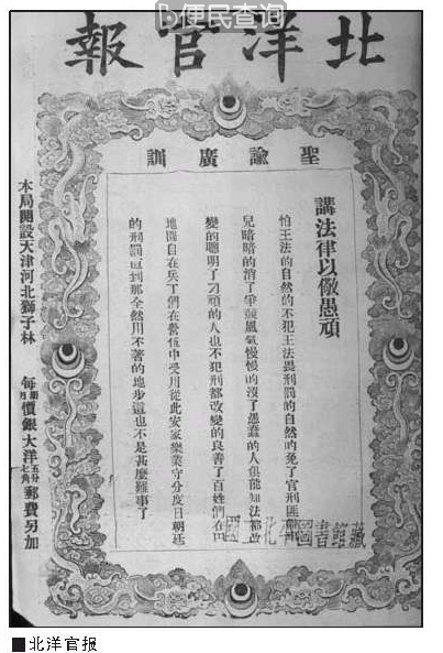 中国第一份官方报纸——《北洋官报》,1901年12月25日创刊,是创办最早、最有影响的地方政府官报。其内容以政府公报为主,兼顾介绍外国社会的情况和新思想、新知识,评论中国的不足之处,提出革新措施,为洋务派的宣传工具。