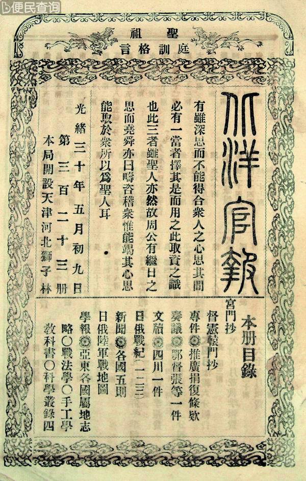 于1901年12月25日《北洋官报》创刊,这是一份清末创办最早、最有影响的地方政府官报。其内容以政府公报为主,但却不一味地迎合政府,也比较系统地介绍外国社会的情况,介绍新思想、新知识,评论中国的不足之处,提出革新措施,成为洋务派的宣传工具。凭借官方传播渠道,起到了“开风气之先”的作用。报纸刊登内容包含圣谕广训直解,上谕,本省政治、学务、兵事,近今时务,农学、工学、商学、兵学、教案、交涉、外省新闻,各国新闻等。设有宫门钞、奏议录要、析法摘要、文牍要录、畿辅近事、外省新闻、各国新闻等栏目。1902年天津设立总局全国发行。