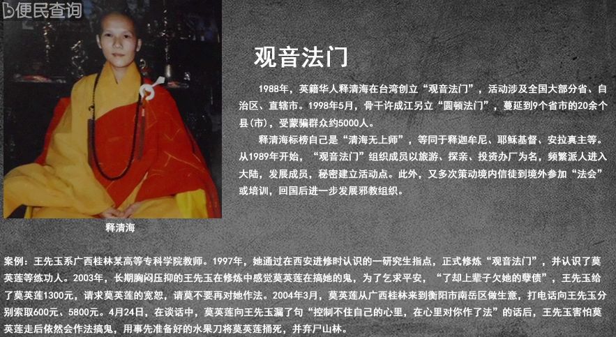 第二类,假借东方传统宗教文化资源,摘取佛教、道教、儒学等经典词句,肆意曲解,编造邪说,自我神化。这类邪教组织多模仿东方神秘主义修炼方式,如素食、坐禅等,刻意营造盲目崇拜教主的神秘气氛。举例言之。1998年,原“观音法门”骨干许成江在吉林市举办“弘法”学习班,宣讲其“潜修”的“圆顿法门”。该邪教组织以“强身健体、消灾治病”为名,发展信徒。教主以“供养”、“圆顿”为名,骗敛钱财。1998年11月至1999年3月,该邪教组织仅在湖南省一地,就聚敛“供养”经费20余万元。经依法治理,该邪教势力已被遏制。