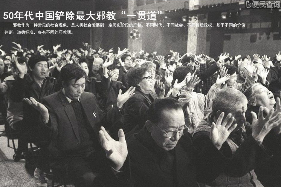 日寇侵华期间,日军认为一贯道宣扬的“万教归一”,“吾道一以贯之”等符合日本统治者所谓儒佛神道的精神统治需求,于是将一贯道作为麻痹民众,为其侵略扩张服务的工具加以扶植和利用。为了寻求支持,张光壁也迎合日寇,一时间,大小汉奸纷纷入道,饱受战乱之苦的百姓受其欺骗,也纷纷人道求安。这时的反动会道门组织名目繁多,分布于全国广大城乡,其化名及旁支别系有50余种,其中影响大、活动范围广、危害严重的有五种:一贯道(又名老母教、天济仙坛、真乙道)、同善社、皈根门(又名普渡门、皇极门、大乘门、收园门、中央门、瑶池门、普佑寺等)、黄学会(又名神兵大刀会)、楠林馆(又名儒教坛、恒善坛、圣教坛、邱祖尤门教、乐坛等),全国共有会道门300余种,道首和骨干分子约82万人,道徒约1300万余人。图为1959年反动会道门组织被摧毁,邪教人员被抓捕。