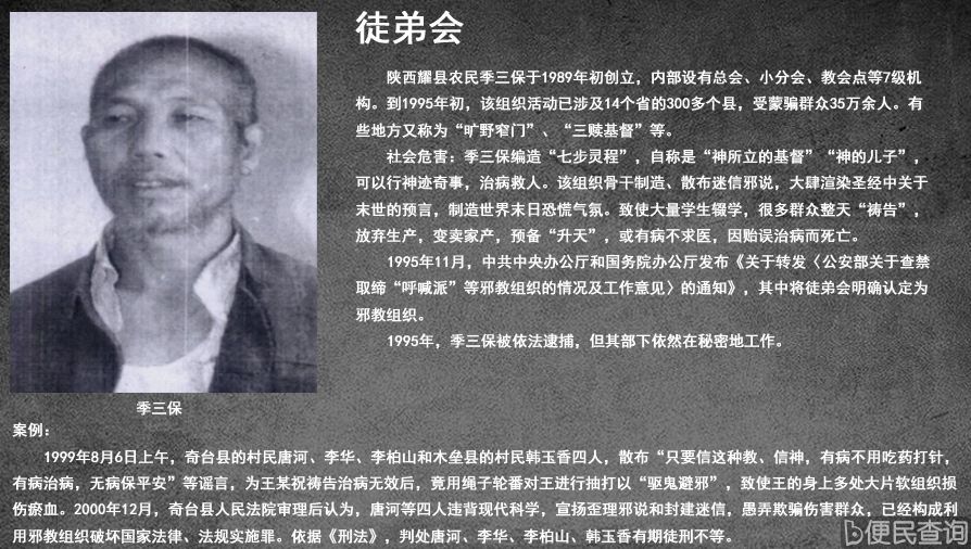 这些邪教组织多数为余孽势力的死灰复燃,20世纪80年代,危害最大的邪教组织是土生土长的徒弟会。1985年,陕西省耀县农民季三保歪曲《圣经》,自称是“神所立的基督”,杜撰邪教教义“七步灵程”,宣称“世界末日来临”、“信教的上天堂,不信的下地狱”。该邪教散布邪说、蛊惑人心、奸污妇女、诈骗钱财,妄图改朝换代,其骨干散布“现在是黑暗当道,魔鬼掌权”,扬言要“推翻黑党,砸烂黑政府”,煽动信徒闹事,围攻政府。经各省公安部门联合行动,依法惩处犯罪分子,其组织基本被摧垮。