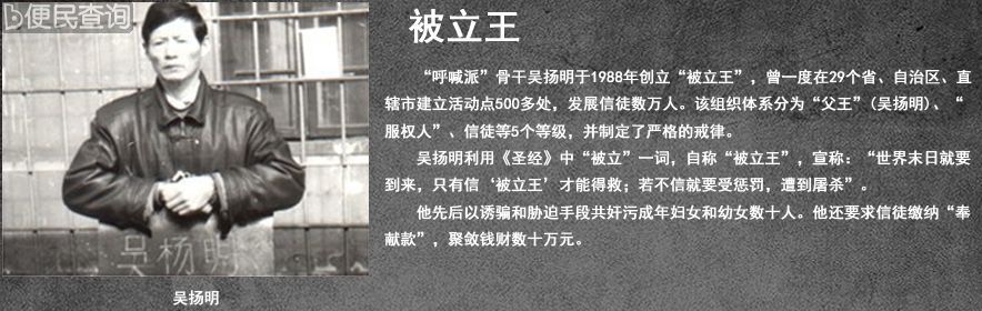 当代中国邪教组织的思想资源类型分为三类。第一类,剽窃西方传统宗教文化资源。这类邪教教主摘取基督教《圣经》中的只言片语,编造邪说,自我造神。其始作俑者,歪曲《圣经》,将自己神化为崇拜的偶像,建立至高无上的绝对权威,以实现其狂妄的野心。1988年,原“呼喊派”骨于吴扬明,歪曲《圣经 路达福音》中“被立”一词,自称“被立王”,标榜自己是耶稣的化身,建立“被立王”邪教组织。他肆无忌惮地神化自己,妄称:“耶稣已过时,只有‘被立王’才是唯一真神。”他编造邪教教义,宣扬“末日”邪说,散布“大难就要来临,人要死去三分之一,只有信‘被立王’才能得救”。