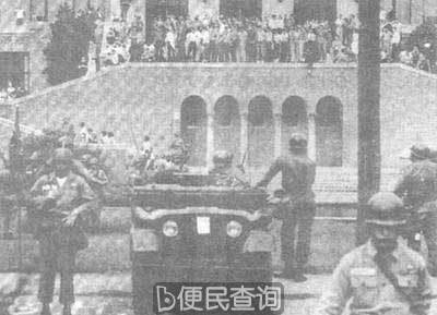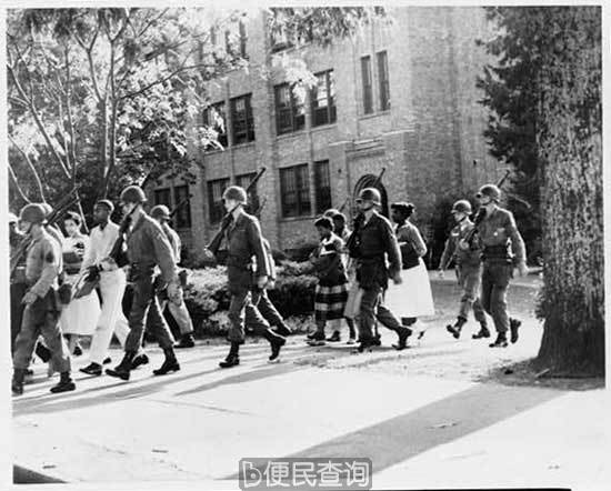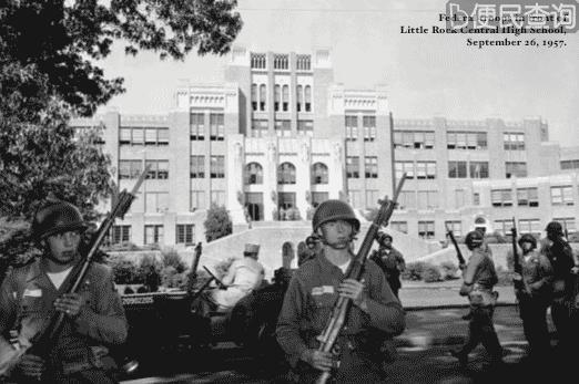 1957年9月25日,全副武装的美国士兵护送15岁的黑人少女明尼珍到小石城中心中学上课