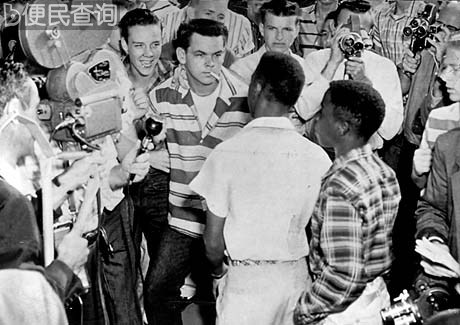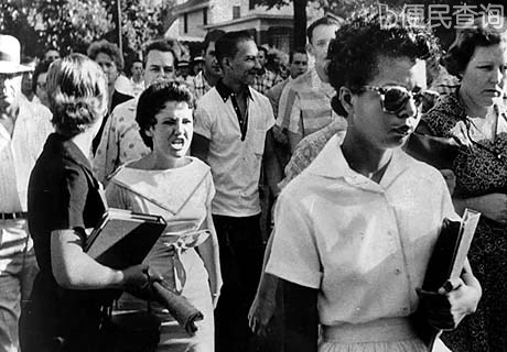 9名黑人学生在严密保护下拿课本走进学校,白人学生怒目而视