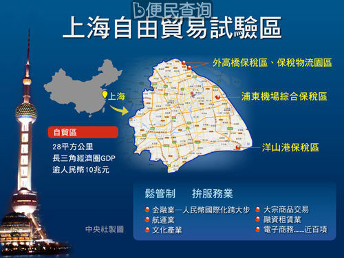 中国(上海)自由贸易试验区(China (Shanghai) Pilot Free Trade Zone),简称上海自由贸易区或上海自贸区,是设于上海市的一个自由贸易区,也是中国大陆境内第一个自由贸易区,并将为上海带来十年发展红利。