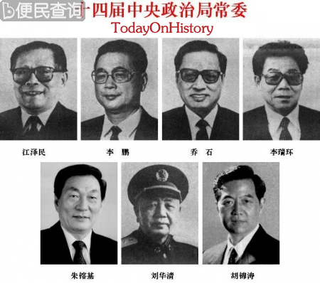 新当选的政治局常委(左起):胡锦涛、李瑞环、李鹏、江泽民、乔石、朱榕基、刘华清