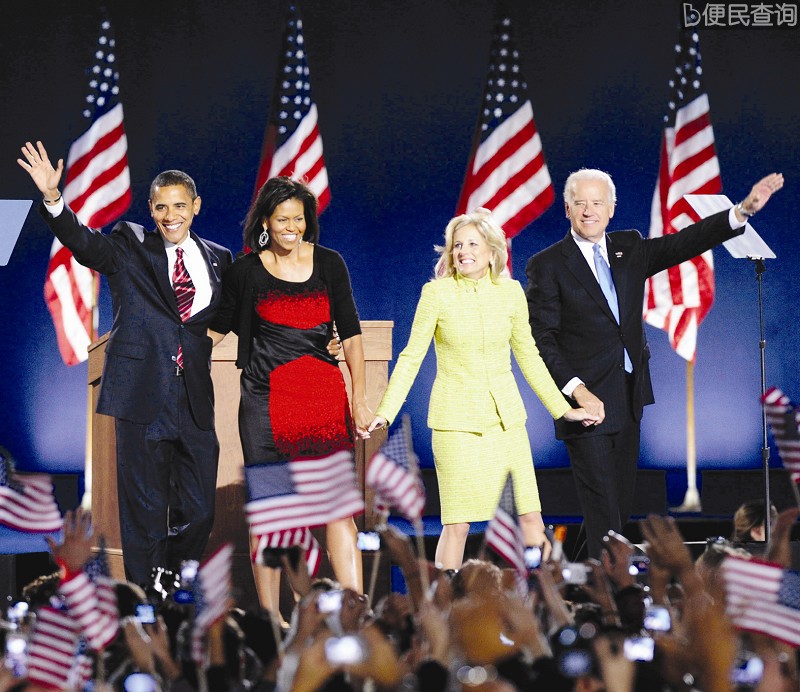 2008年11月4日,美国民主党总统候选人、伊利诺伊州参议员奥巴马(左一)在芝加哥宣布大选获胜后与妻子米歇尔(左二)、当选副总统拜登(右一)夫妇向支持者致意。