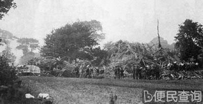 被击落后在英国东南部埃塞克斯的西默西燃毁的齐伯林飞艇的残骸