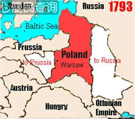 1793年1月23日俄、普在彼得堡签订第二次瓜分波兰的协定。协定使俄国割占了包括明斯克在内的白俄罗斯的一部分、立陶宛的一部分以及第聂伯河以西的大部分乌克兰地区,面积达25万平方公里清鲁士占有波兹南、伊里什、陈斯比霍夫、托伦、革但斯克等,面积为5.8万平方公里;波兰其余部分领土上的实权也被俄国驻波兰大使所掌握。第二次瓜分后,波兰不复为一个独立国家。