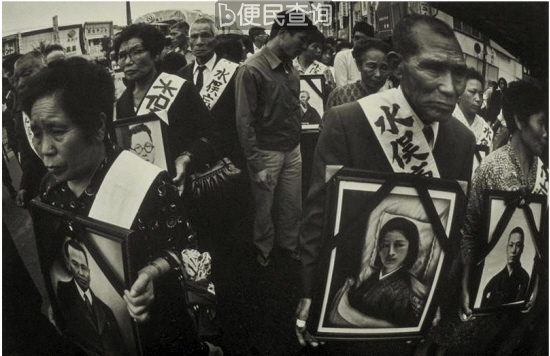 ▲对氮肥公司诉讼期间,水俣病患者拿着他们死去的亲人的照片(尤金·史密斯《水俣》系列)