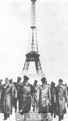 希特勒及其部下在巴黎市中心埃菲尔铁塔下走过
