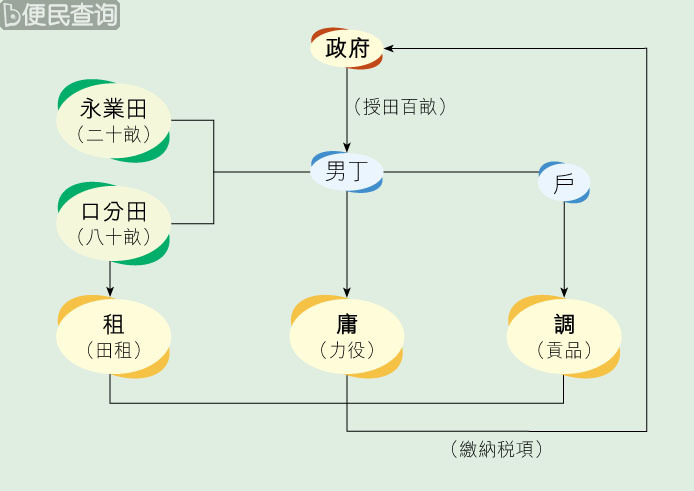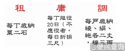 中国唐代前期所实行的赋役制度。唐高祖武德二年二月十五日(619年3月6日)初定租庸调法)在原有的均田制基础上﹐制订了租庸调赋税制。唐初均田制规定:中男(年16~20岁)、丁男(年21~59岁)受田100亩(其中80亩为口分,20亩为永业);老男、笃疾、废疾者40亩,寡妻妾30亩,道士30亩﹐女冠20亩﹔官员受田有永业、职份和公廨田之分,郡王、国公至五品官员,永业田从100顷至5顷等差。六品官以下在本乡分配。在此基础上规定租庸调的征课标准为:租,每丁纳粟二石,岭南诸州纳米(上户1.2石,次户8斗,下户6斗);调,每户每年交绢二丈,绵三两,产布之乡纳布二丈五尺,麻三斤;庸,每丁每年为官府服役20天,遇闰加二天。此外,有事而加役15日者免调﹐加役30日者租调皆免;但连正役不得超过50日。不亲自服役者,可纳绢代役,每日绢三尺。贵族免役。租庸调法还规定出依照灾情轻重,减收或免收租庸调的具体办法。